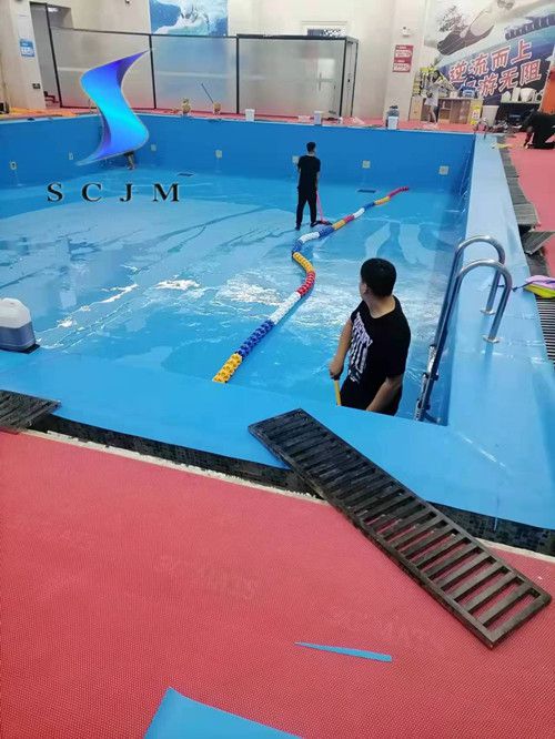本項目位于河北省唐山市地區,基礎面為混凝土結構,基礎面水泥砂漿找平處理,達到平整、干燥、不起砂后使用滿刮膠搭邊熱熔焊接工藝進行游泳池膠膜拼接安裝,整體下過如下: